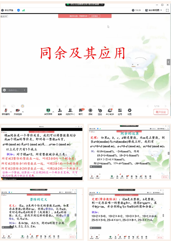 2月5日下午,福州鼓山中学易亚林老师为同学们讲授了关于同余及其应用的相关知识点,易亚林老师利用现实生活中的实际问题引入关于同余及其应用的知识点,激发同学们的学习兴趣。易亚林老师以浅入深地为同学们讲授了关于整除和带余除法及同余的知识点,在课堂中,易亚林老师还告诉同学们需要把新知识和新的数学定义迁移到学过的数学知识和数学定义,这样能够使同学们更好地理解新学的知识,更快地吸收知识。