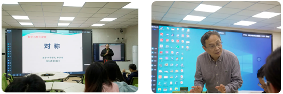 林亚南教授以轴对称图形为切入点,引出关于对称的相关介绍,通过剪纸游戏、火柴问题、最短路径问题等,引导同学们发现蕴含于其中的数学原理——对称。