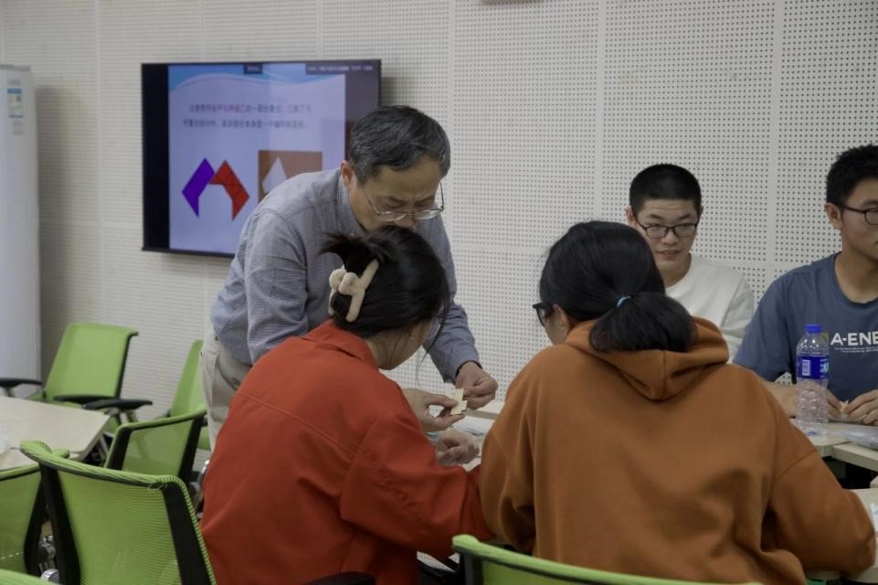 在讲座过程中,林亚南教授通过简单的拼板,让同学们在拼摆游戏中,研究拼板各个重合部分的关系,结合数理知识,探寻拼板的对称轴及其规律。