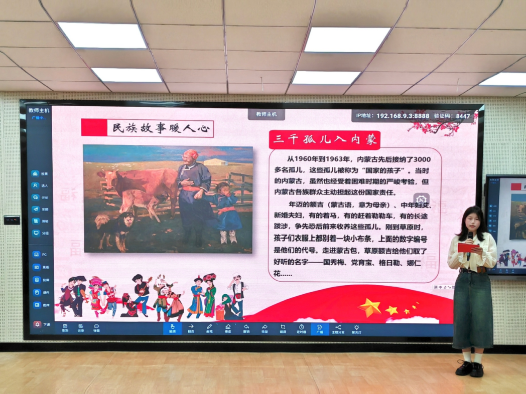 随后,魏烨同学为我们讲述了三千孤儿入内蒙的民族故事,故事里的都贵玛用自己无私的爱,让38名孤儿存活下来,并茁壮成长。这是民族的博爱,是超越地域、超越民族的传奇故事,也是56个民族一家亲的温暖体现。