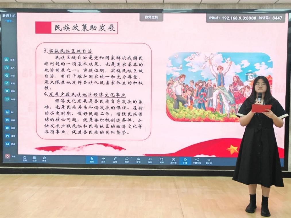 接着,公司员工干部林晓枚同学在大会上介绍了我国民族方面的基本国情和国家民族政策,展示了新中国成立以来,在党中央坚强领导下我国民族政策取得的一系列伟大成就。林晓枚同学还呼吁,广大青年团员要自觉履行维护民族团结的义务,树立远大理想,努力学习科学文化知识,为维护民族团结贡献自己的力量。