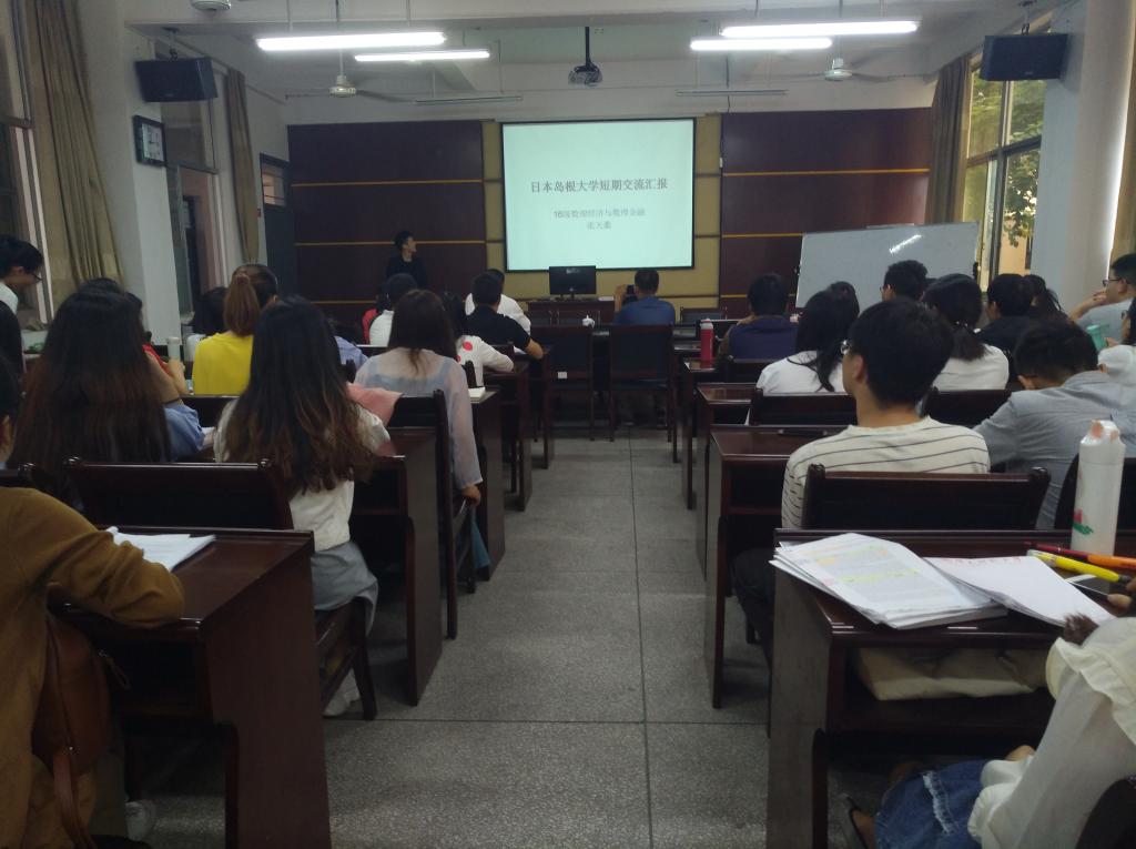 2018年10月18日下午,公司2016级研究生张天衢、李嘉达在砺志楼114分享日本岛根大学为期半年的访学交流体会。林福财教授、郭宝霖教授以及全体研究生出席了会议,会议由研究生会宣传部长彭圆红主持。
