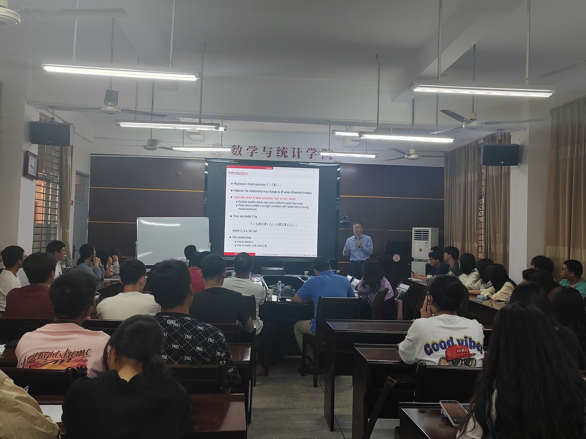 报告中,黎德元教授主要介绍了一种最大线性尾回归模型,该模型专门用于捕捉当协变量呈现极高或极低值情况下的极端关系,并介绍了利用一种基于极值理论的新的M-估计器估计回归系数,严格建立了所提出估计量的一致性和渐近正态性。通过仿真结果表明,该估计方法优于条件最小二乘法。最后,介绍了通过使用财务数据等案例验证了模型的实际适用性。报告结束后,在座的师生就相关研究问题进行了探讨和交流。