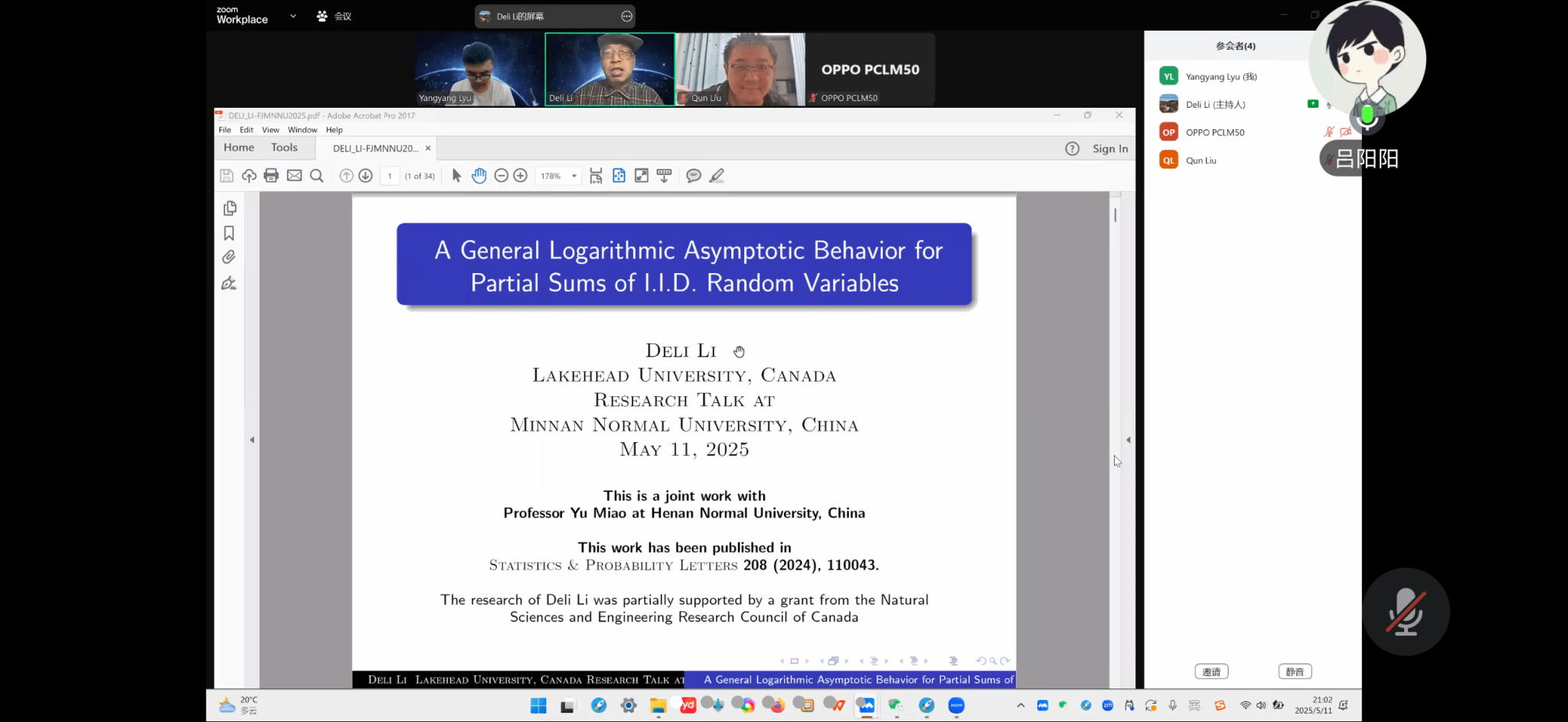 应公司邀请,5月11日晚上,加拿大湖首大学李德立教授在腾讯会议中作了题为《A general logarithmic asymptotic behavior for partial sums of i.i.d. random variables》的讲座。相关师生聆听了此次讲座,该讲座由孙慧老师主持。