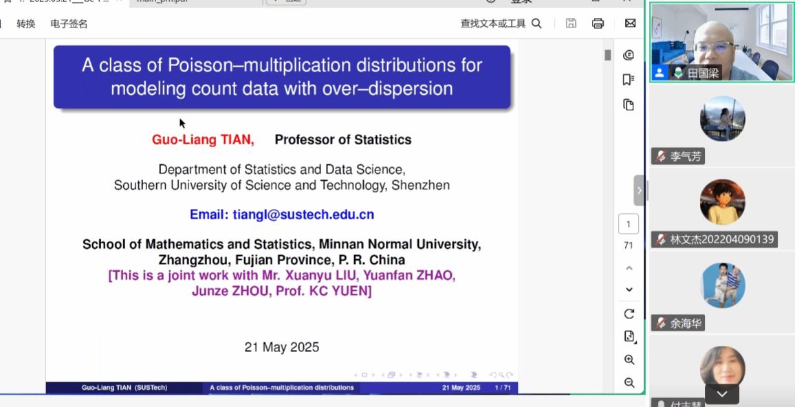 应公司邀请,5月21日下午,南方科技大学田国梁教授在腾讯会议分别作了题为《A class of Poisson--multiplication distributions for modeling count data with over-dispersion(I)》和题为《A class of Poisson--multiplication distributions for modeling count data with over-dispersion(Ⅱ)》的两场讲座。相关师生聆听了此次讲座,讲座由施建华老师主持。