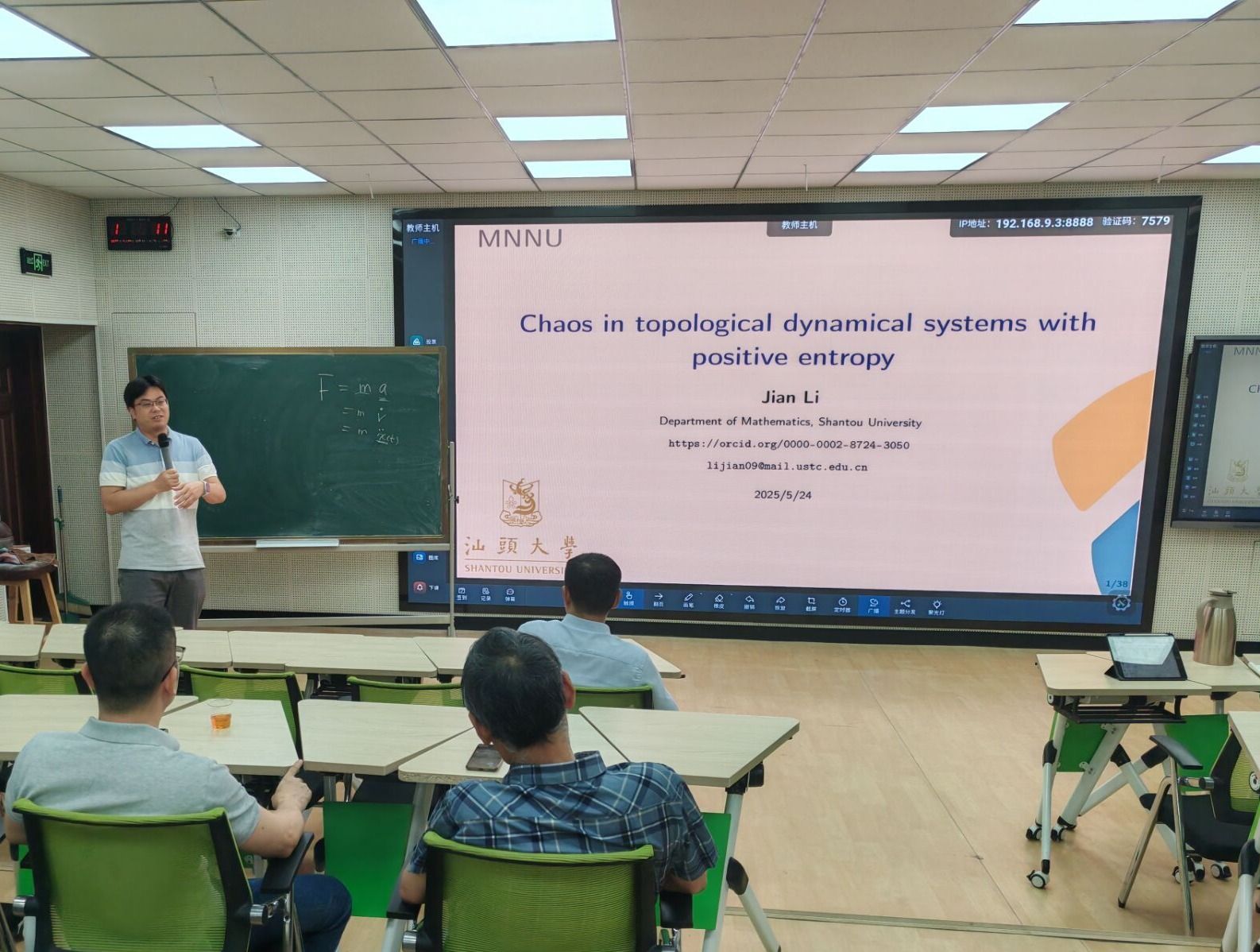 应公司邀请,5月24日下午,汕头大学数学科学公司李健教授在砺志楼131作了题为《Chaos in topological dynamical systems with positive entropy》的报告。公司相关方向的教师和研究生参加了此次讲座,讲座由唐忠宝老师主持。