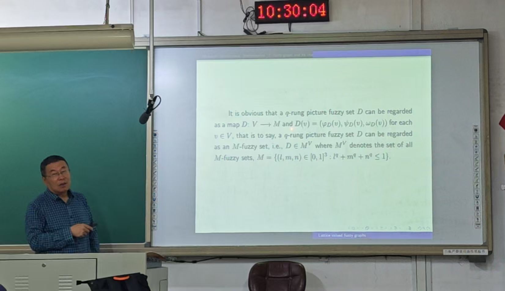 讲座中,史福贵教授首先为听众介绍了模糊图在现实生活中的广泛应用。据史教授介绍,迄今为止,已有许多关于模糊图的扩展,如直觉模糊图、毕达哥拉斯模糊图、费马模糊图、q - 阶正交对模糊图、图像模糊图、球形模糊图、q - 阶图像模糊图、区间值模糊图、单值中智模糊图、双极模糊图、m - 极模糊图等等。而在此次的研究中,史教授及其研究团队证明了这些模糊图都可以看作是特殊的格值模糊图,并在此基础上给出格值模糊图的一些特征刻画,而此次讲座则是史教授对其研究成果的详细介绍。