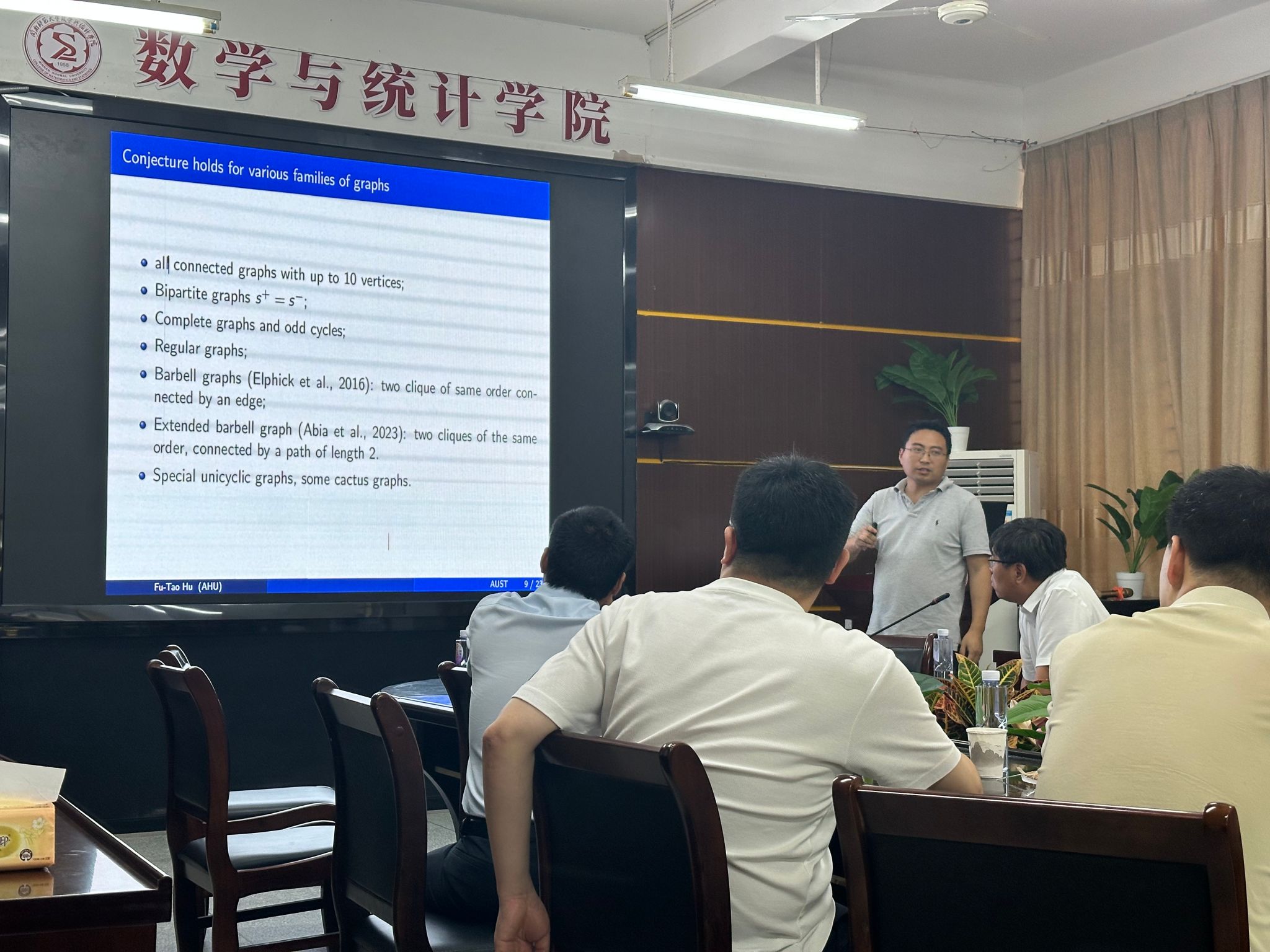 在讲座中,胡夫涛教授主要为听众介绍了图论作为数学领域的重要分支,在众多学科中有着广泛应用,图的能量相关研究更是其中的热点。图G的平方能量s(G),其定义为图G正特征值平方和与负特征值平方和之中的最小值。这一概念的提出,为研究图的代数性质提供了全新视角。胡教授指出,在图的平方能量研究进程中,Elphick 等人于 2016 年发表在《离散数学》期刊的论文《图正特征值平方和的猜想界》中,提出了一个重要猜想:对于任意连通图而言,其平方能量至少为该图的阶数减 1。这一猜想引发了众多学者的关注和研究,对推动图的能量理论发展具有重要意义。在本次学术报告中,胡教授为大家系统介绍一些关于图平方能量的基础结果。胡教授指出,其研究团队经过深入研究与严谨论证,证实了对于独立数不超过 2 的图,上述猜想是成立的。不仅如此,在探索过程中,胡教授及其团队还获得了一些全新的研究成果,这些新成果将进一步丰富图的平方能量理论体系,也期待能为该领域后续研究提供新的思路和方向。