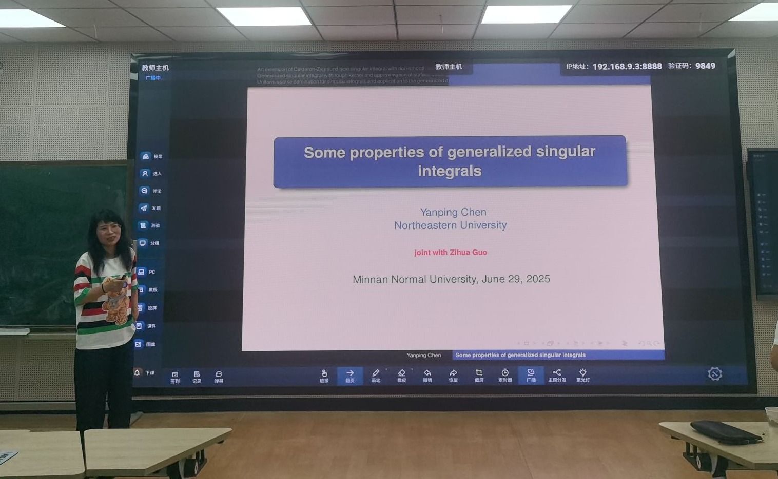 应公司邀请,6月29日早上,东北大学陈艳萍教授在砺志楼131作了题为《Some properties of generalized singular integrals》的讲座。相关师生聆听了此次讲座,讲座由温泳铭老师主持。