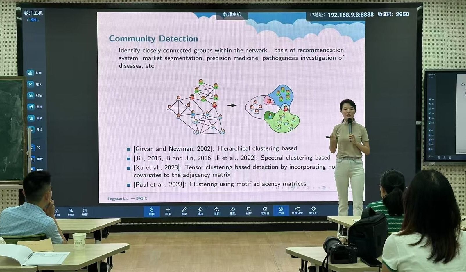 在讲座中,刘婧媛教授首先为听众介绍了社区检测。社区检测专注于恢复网络内的群体结构,是网络分析中至关重要的基础性任务。然而,当社区信号较弱时,检测过程可能极具挑战性且不稳定。受新收集的来自Web of Science的大规模学术网络数据集(包含多层网络信息)的启发,刘教授及其研究团队提出了一种用于识别社区的二分图辅助谱聚类方法(BASIC),该方法将二分图网络信息纳入主网络的社区结构学习中。再度校正随机块模型框架的基础上,刘教授及其研究团队通过理论验证以及大量仿真研究的数值验证,使得BASIC的准确性和稳定性增强得以证实。