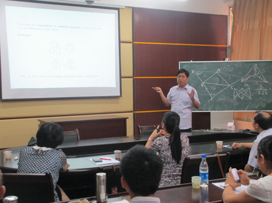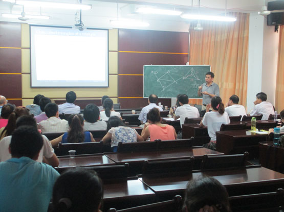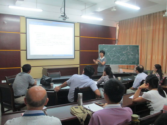 首先,董峰明副教授作了题为《Two Optimization Problems in Plane Geometry》的报告,主要从三角形出发介绍了两个优化问题,其中一个是平面上的Steiner Tree 问题,另外一个问题是关于寻找给定的N边形的最大外接等角N边形。接着,厦门大学数学科学公司博士生导师张莲珠教授做了题为《The Problem of Pfaffian Orientations on Graphs》的报告,主要介绍了Defnition and Notations、The Problem on Enumerating Perfect Matchings、Contractions、Compressions、Three Minimal non-Pfaffian Graphs等内容。最后,厦门大学数学科学公司博士生导师金贤安教授做了题为《Several Simple Problems on Plane Graphs in Knot Theory》的报告,主要从Links and Graphs、Several indices on plane graphs、Two open problems进行了深入介绍。