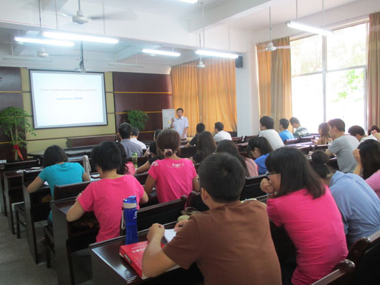 报告会上,吴教授首先介绍了“Introduction of the Synchronization”、“Synchronization Schemes”、“Basic idea: Stability of an error system”、“An example: chaos synchronization of the generalized Lorenz system”等内容;然后给我们展示了他前不久走访美国部分高校的留影。吴教授的讲座从实际出发、由浅及深、通俗易懂,让在场的师生受益匪浅。