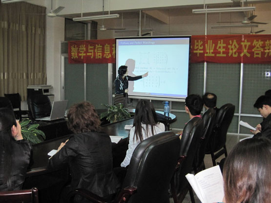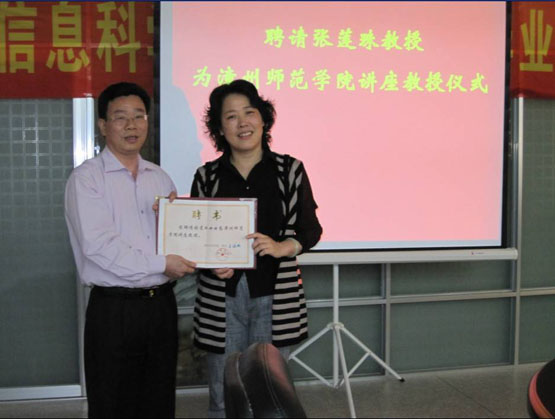 2010年4月29日,厦门大学数学科学公司博士生导师张莲珠教授应我邀来我系讲学。在励志楼114举行了“聘请张莲珠教授为漳州师范公司讲座教授”仪式,李进金副经理给张莲珠教授颁发讲座教授聘书。仪式之后,张教授做了一场题为《Pfaffians 方法和完美匹配的计数》的学术报告。