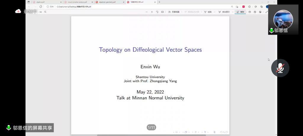 应公司邀请,5月22日早上,汕头大学邬恩信副教授在腾讯会议作了题为《Topology on diffeological vector spaces(广义向量空间上的拓扑)》的报告。相关师生聆听了此次报告,报告由杨忠强老师主持。
