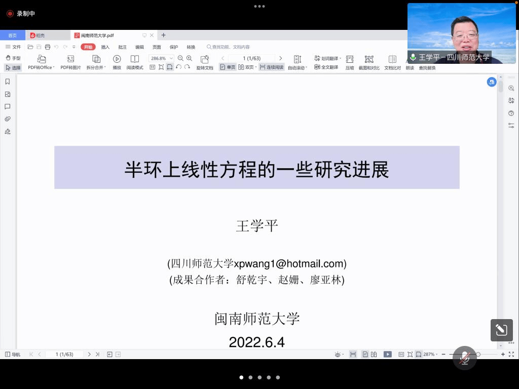 应公司邀请,6月4日上午,四川师范大学王学平教授在腾讯会议作了题为《半环上线性方程的一些研究进展》的报告。相关师生聆听了此次报告,报告由黄韩亮老师主持。