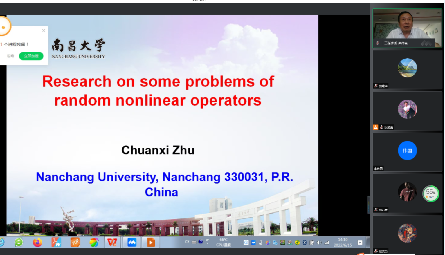 应公司邀请,6月15日早上,南昌大学朱传喜教授在腾讯会议作了题为《Research on some problems of random nonlinear operators关于随机非线性算子若干问题的研究》的报告。相关师生聆听了此次报告,报告由施建华老师主持。