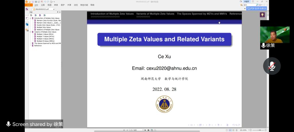 应公司邀请,8月28日下午,安徽师范大学徐策副教授在腾讯会议作了题为《Multiple Zeta Values and Related Variants》的报告。相关师生聆听了此次报告,报告由曹炜老师主持。