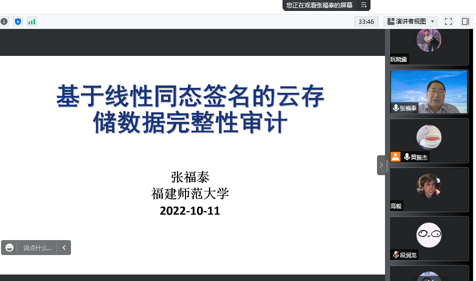 应公司邀请,10月11日下午,福建师范大学张福泰教授在腾讯会议作了题为《基于线性同态签名的云存储数据完整性审计》的报告。相关师生聆听了此次报告,报告由黄振杰老师主持。