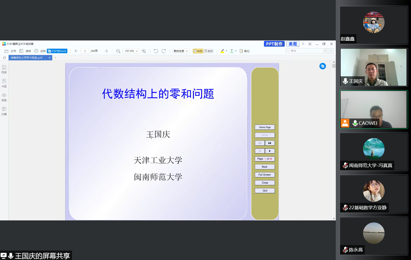 应公司邀请,10月14日下午,天津工业大学数学科学公司王国庆教授在腾讯会议作了题为《代数结构上的零和问题》的报告。相关师生聆听了此次报告,报告由曹炜老师主持。