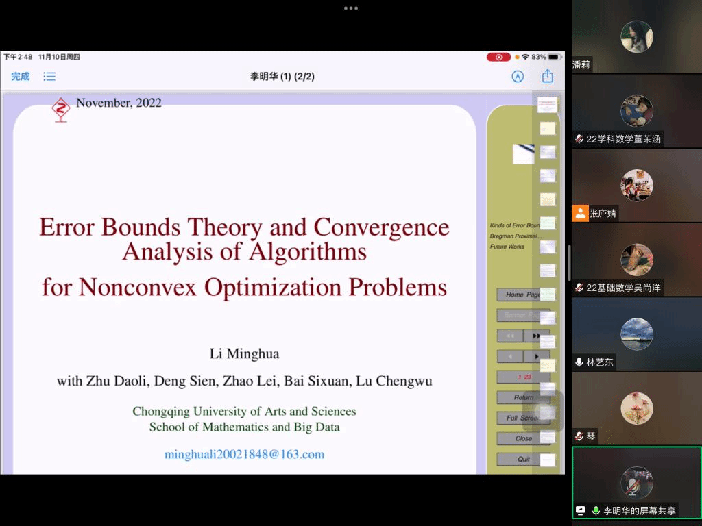 应公司邀请,11月10日下午,重庆文理公司李明华副教授在腾讯会议作了题为《非凸函数的误差界理论及在下降算法收敛率中的应用》的报告。相关师生聆听了此次报告,报告由林艺东老师主持。