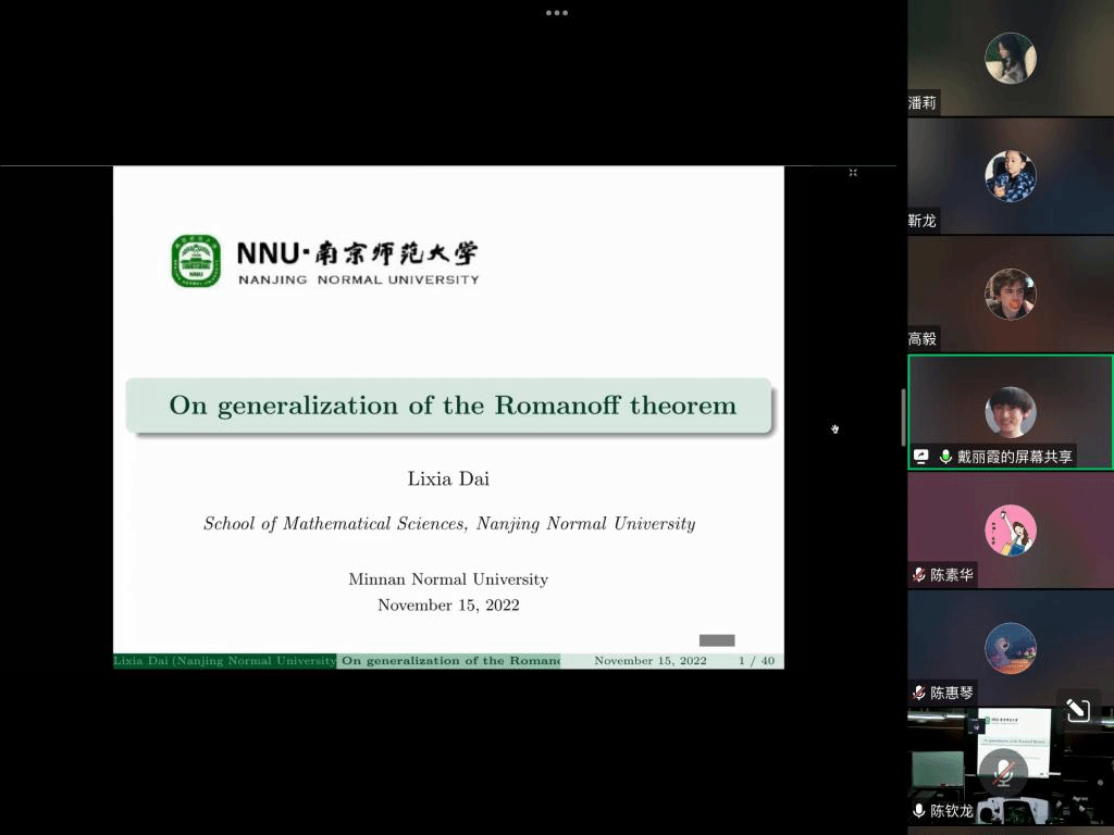 应公司邀请,11月15日下午,南京师范大学戴丽霞教授在腾讯会议作了题为《On generalization of the Romanoff theorem》的报告。相关师生聆听了此次报告,报告由曹炜老师主持。