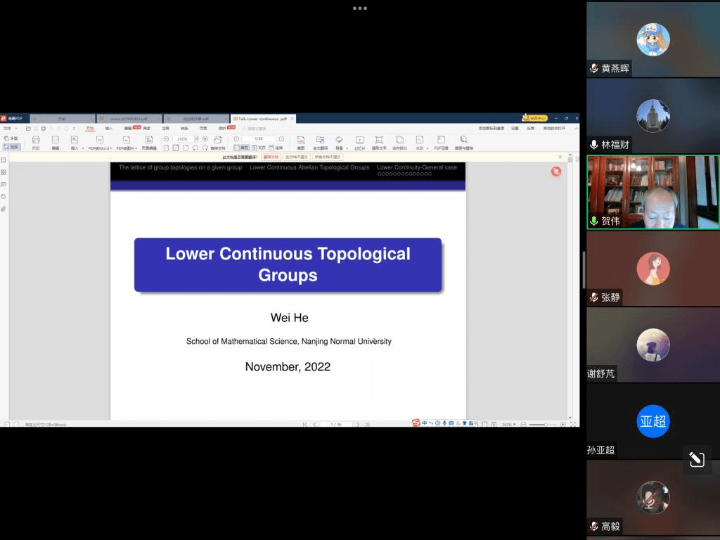 应公司邀请,11月19日上午,南京师范大学贺伟教授在腾讯会议作了题为《Lower Continuous Topological Groups》的报告。相关师生聆听了此次报告,报告由林福财老师主持。