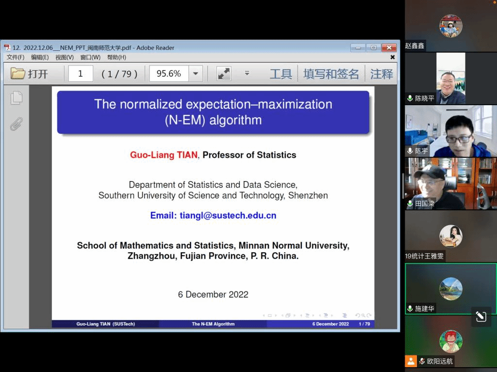 应公司邀请,12月6日下午,南方科技大学田国梁教授在腾讯会议作了题为《The normalized expectation-maximization (N-EM) algorithm》的报告。相关师生聆听了此次报告,报告由陈宇老师主持。
