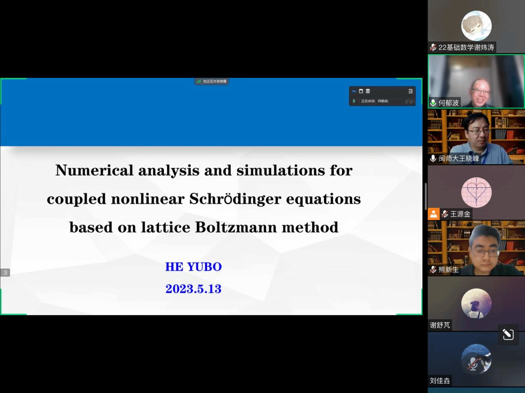 应公司邀请,5月13日晚上,怀化公司何郁波教授在腾讯会议作了题为《Numerical analysis and simulations for coupled nonlinear Schrödinger equations based on lattice Boltzmann method》的报告。相关师生聆听了此次报告,报告由王晓峰老师主持。