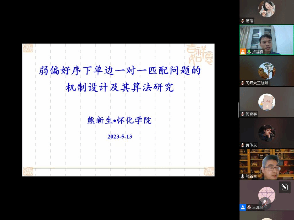 应公司邀请,5月13日晚上,怀化公司熊新生副教授在腾讯会议作了题为《弱偏好序下单边一对一匹配问题的机制及其相应算法设计》的报告。相关师生聆听了此次报告,报告由卢福良老师主持。