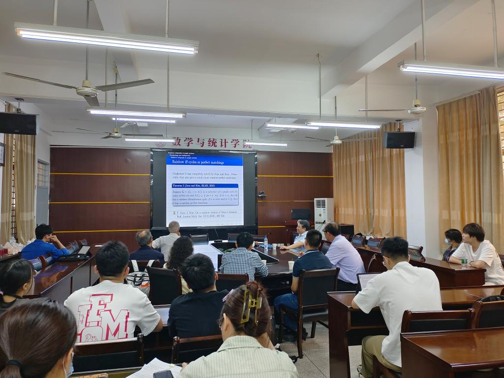 报告中,李学良教授针对彩虹子图提出一些概念,设G={G1,G2,…,Gm}是同一顶点集V上的n图系统,F是e(F)≤m的简单图。如果存在一个映射f:E(F)→[m]使得e∈e(G_{f(e)}),对于每个e∈e(f),则f被称为G的部分横切。如果e(f)=m,则它被称为G的横切。我们还说,如果F既是横切,又是路/圈/三角形/匹配,则F是路/圈/三角形/匹配(部分)横切。由于F的所有边都属于G的不同图,我们也将F称为G的彩虹子图。在本次报告中,我们将调查一些关于图系统彩虹子图的已知结果。还提出了一些尚未解决的问题供进一步研究。报告结束后,在座的师生就相关研究问题进行了探讨和交流。