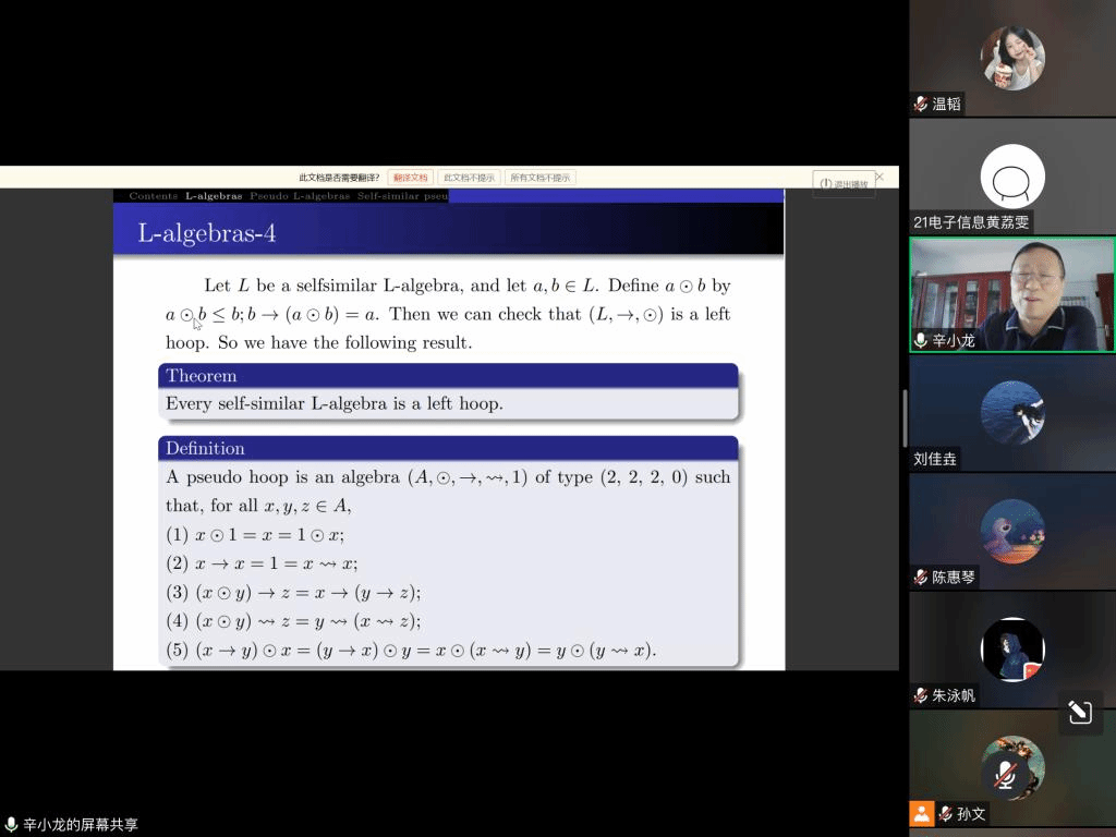 应公司邀请,5月18日下午,西北大学辛小龙教授在腾讯会议作了题为《The unified model of quantum logic and fuzzy logic-pseudo L-algebras》的报告。相关师生聆听了此次报告,报告由李进金老师主持。