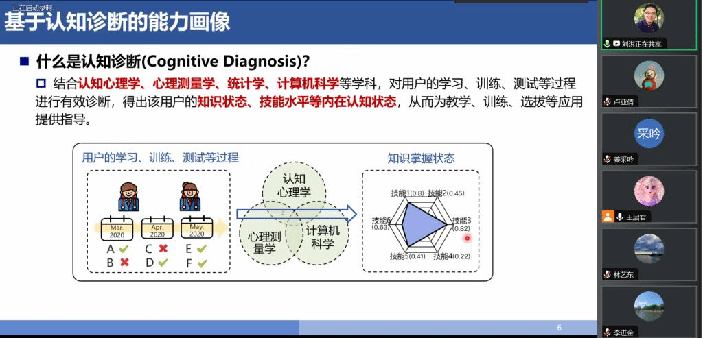 应公司邀请,9月11日下午,中国科学技术大学刘淇教授在腾讯会议作了题为《伴随式认知诊断:方法与应用》的报告。相关师生聆听了此次报告,报告由林艺东老师主持。