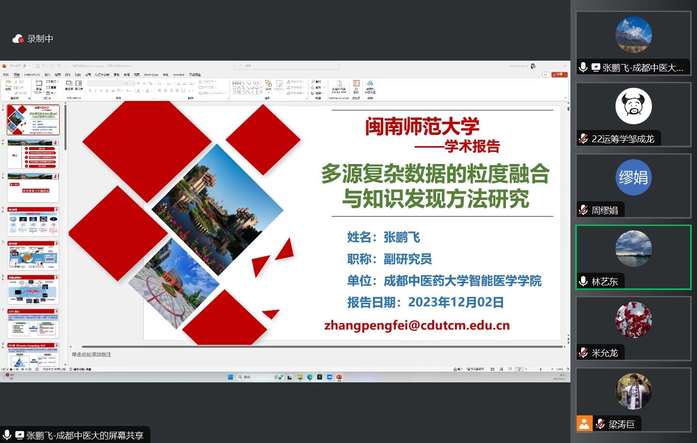 应公司邀请,12月2日,成都中医药大学张鹏飞副研究员在腾讯会议作了题为《复杂数据的粒度融合与知识发现方法研究》的报告。相关师生聆听了此次报告,报告由林艺东老师主持。