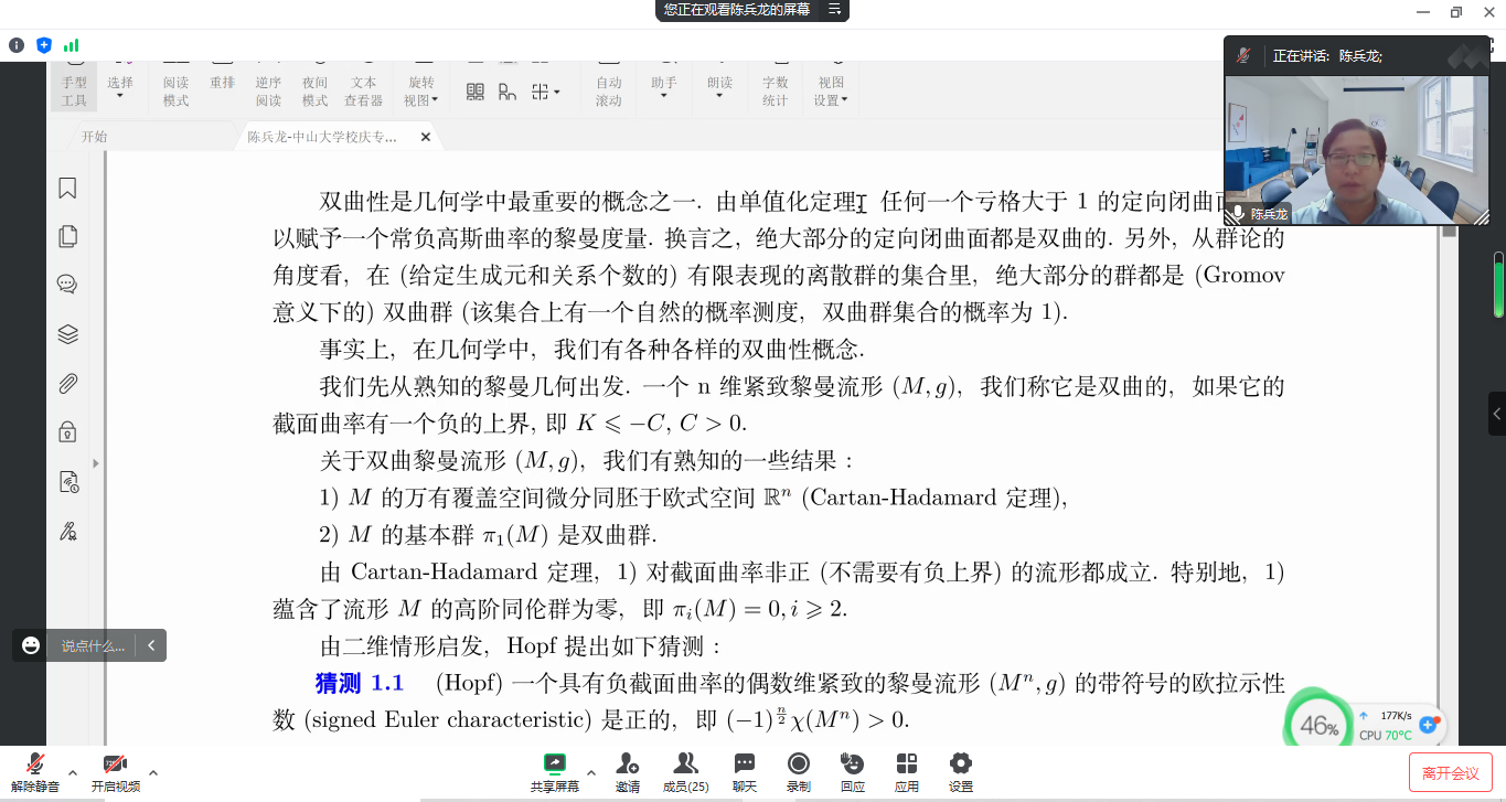 应公司邀请,4月11日晚上,中山大学陈兵龙教授在腾讯会议作了题为《几何中的双曲性与基本群》的报告。相关师生聆听了此次报告,报告由黄韩亮、吴晓锋老师主持。