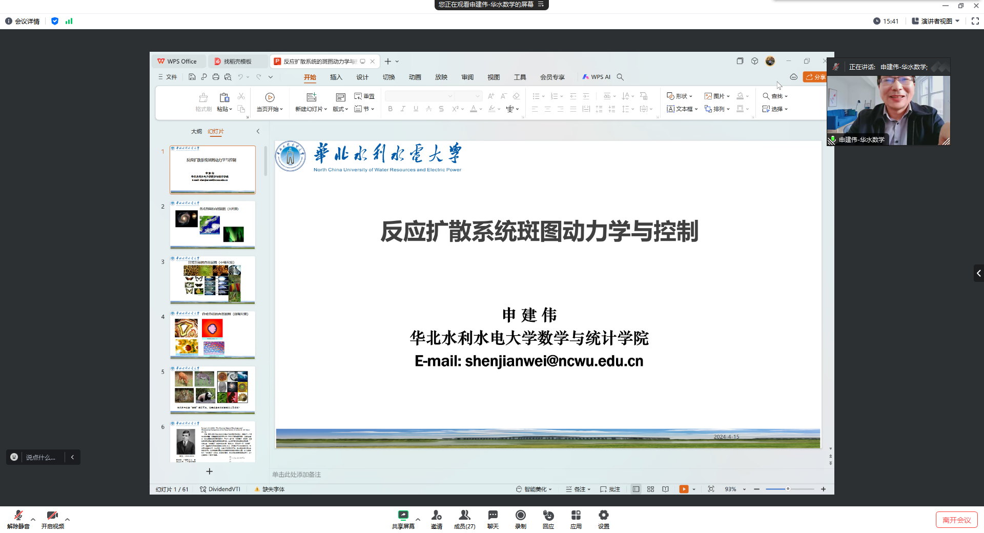 应公司邀请,4月15日下午,华北水利水电大学申建伟教授在腾讯会议作了题为《反应扩散系统斑图动力学与控制》的报告。相关师生聆听了此次报告,报告由黄韩亮老师主持。