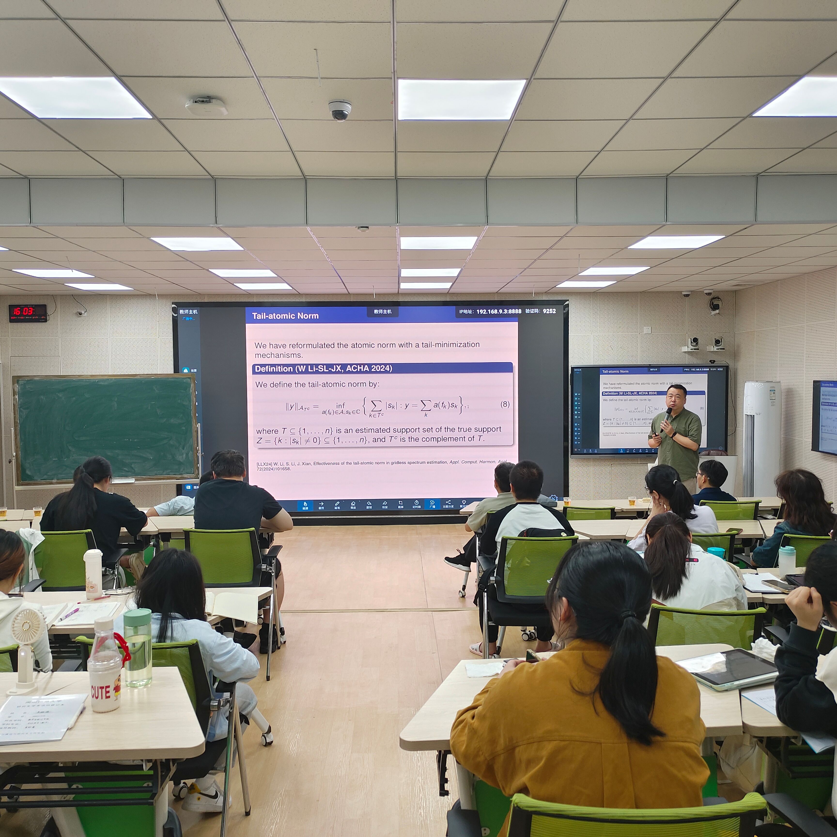 应公司邀请,4月25日下午,中山大学冼军教授在砺志楼131作了题为《Effectiveness of the tail-atomic norm in gridless spectrum estimation》的报告。相关师生聆听了此次报告,报告由吴晓锋老师主持。