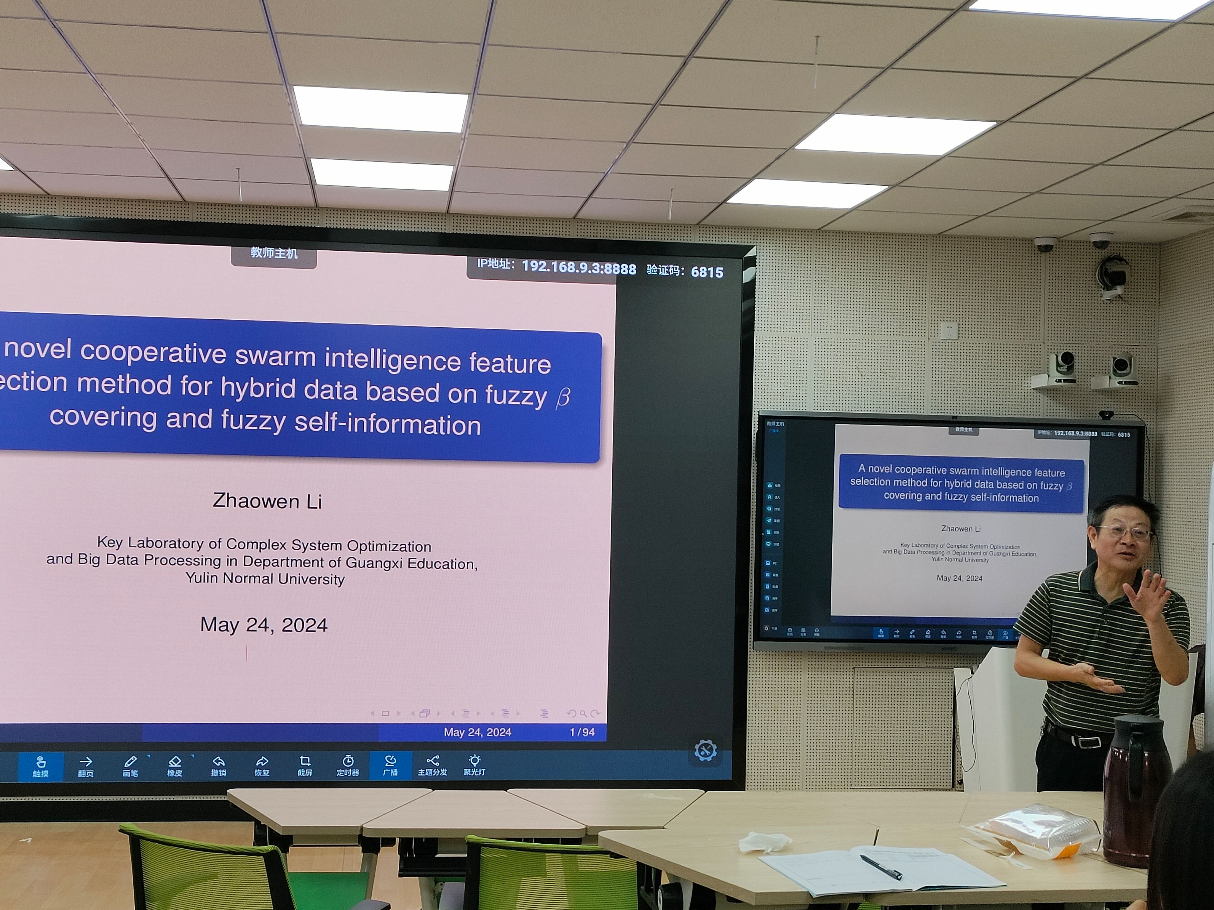 应公司邀请,5月24日上午,玉林师范大学李招文教授在砺志楼114作了题为《一种基于模糊β覆盖和模糊自信息的混杂数据的协同群智能特征选择方法》的报告。相关师生聆听了此次报告,报告由林国平老师主持。
