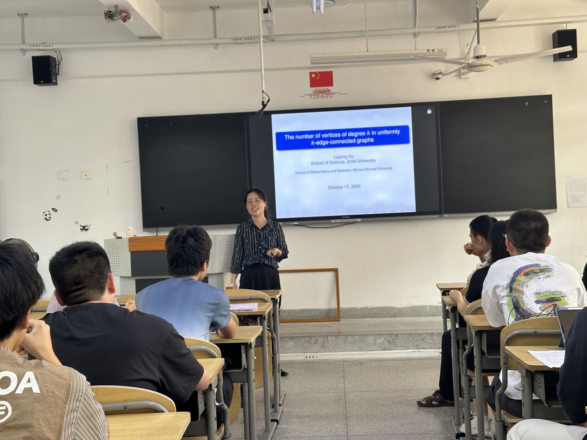 报告中,徐丽琼教授通过考虑均匀k边连通简单图的悬挂树,得到了均匀k边连通简单图中度数为k的顶点数的下界,该结果推广了其他学者关于最小k边连通简单图的结果。此外,徐丽琼教授还介绍了一种均匀k边连接图的归纳构造方法。报告结束后,在座的师生就相关研究问题进行了探讨和交流。