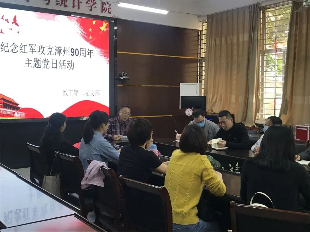 教工党支部积极邀请支部老党员结合中央红军东路军漳州战役要图对毛主席率领中国工农红军东路军攻克漳州的历史进行了详细的阐述,再现当时红军攻克漳州的情景。组织党员观看《红军进漳》微电影、《芝山红楼—红军攻克漳州历史介绍》电教片等,并畅谈自身感受和体会。支部党员们纷纷表示将学习革命先辈们勇往无畏的革命精神,坚定理想信念,不断提升自身能力,为建设新闽南师大贡献力量。