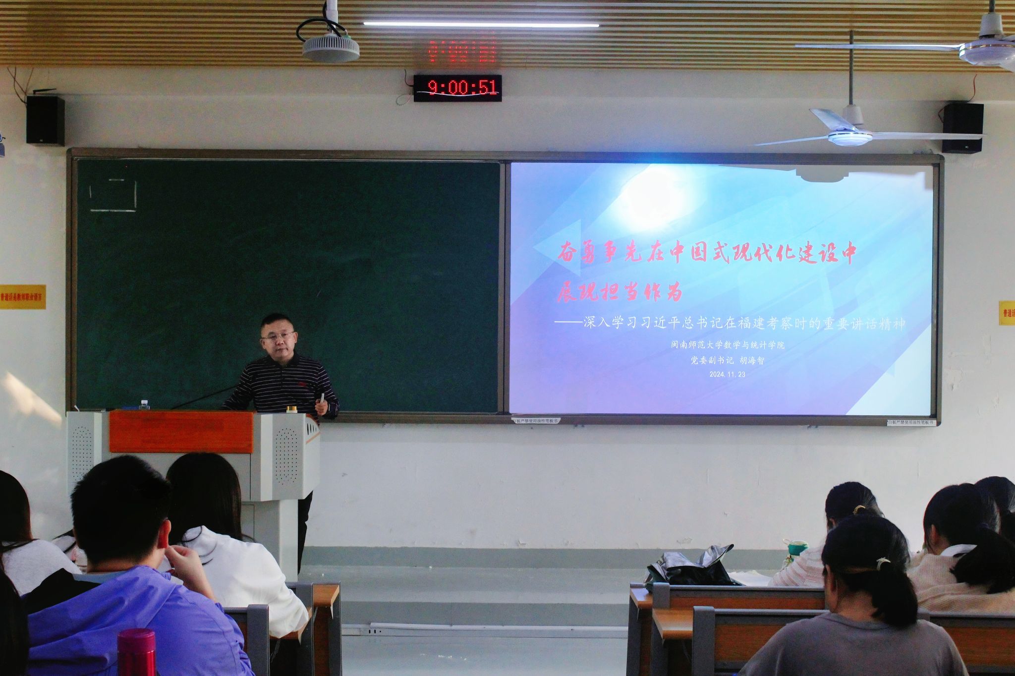 11 24 日上午,公司党委副书记胡海智老师深度解读习近平总书记在福建考察时的重要讲话精神,强调以中国式现代化全面推进中华民族伟大复兴的中心任务。胡海智老师对学员们寄予厚望,鼓励大家以饱满的热情和无限的活力投身国家建设与社会发展,在时代浪潮中勇挑重担,为实现民族复兴、推动人类进步贡献力量。