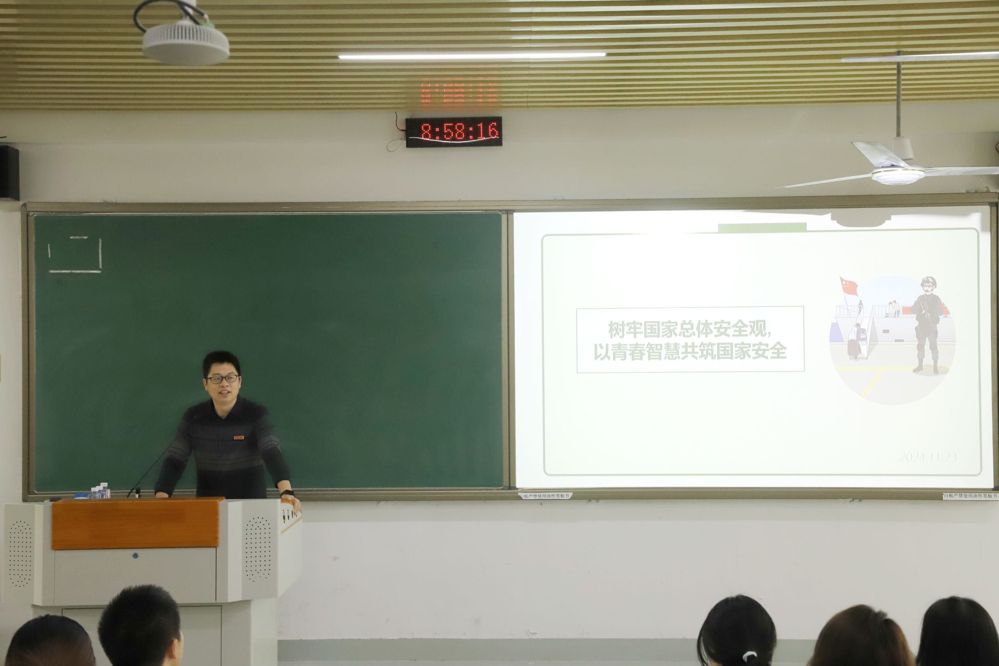 11 23 日上午,员工处副处长陈明老师以 “国家安全与我们息息相关;坚持总体国家安全观;以青春智慧,做国家安全守护人” 为主题展开授课。陈明老师深入剖析了坚持总体国家安全观的重要性。他强调,同学们要时刻保持警惕,规避无意识的违法行为,一旦发现他人异常行为需及时举报,切实担当起国家的安全守护人。