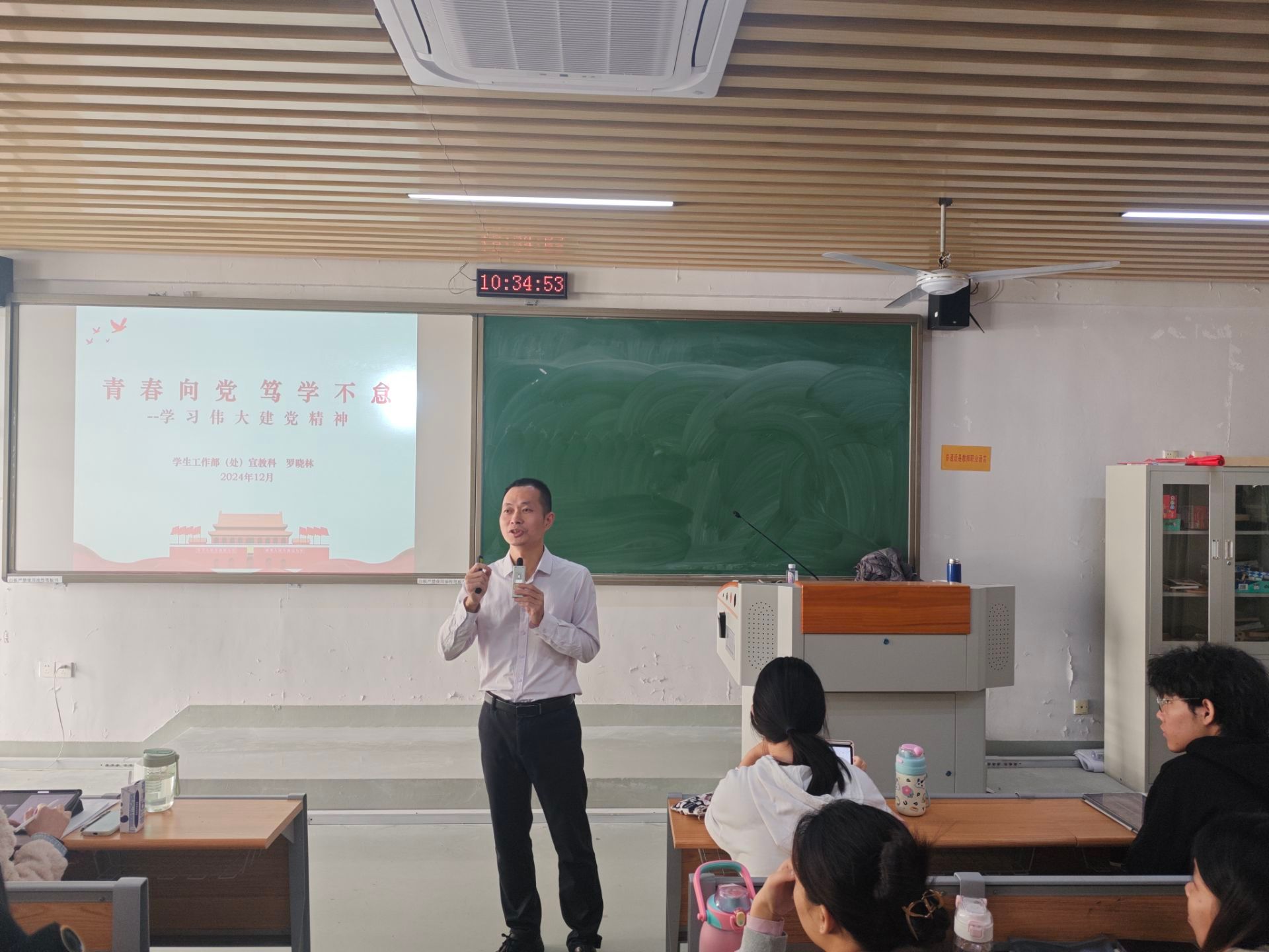 12 1 日上午,校员工处宣传教育科科长罗晓林老师带领同学们回顾了 “中国共产党的创立、新民主主义革命时期、社会主义革命和建设时期、改革开放和社会主义现代化建设新时期、中国特色社会主义进入新时代” 等不同阶段的建党精神。罗晓林老师指出,党的领导是伟大建党精神的 “政治灵魂”,生动的讲述让学员们坚定了传承和发扬伟大建党精神的决心,激励大家在未来工作中砥砺奋进。