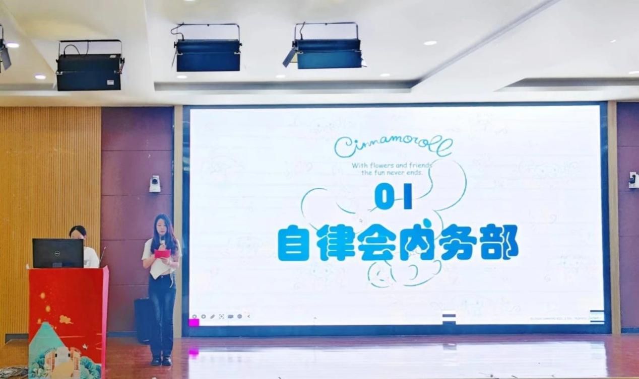 自律会内务部代表向与会人员介绍了内务大检的检查时间、检查内容及卫生抽查的相关细则,并通过展示规范案例和错误案例图片向舍长们介绍了高效有序整理内务的要点。