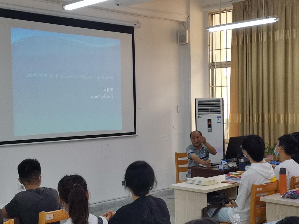 数学系主任周仕荣教授在砺志楼105为2020级教育硕士新生们介绍“数学教育及学科教学(数学)团队情况”。周仕荣教授先就“公司数学教育类硕士发展情况”向大家做了详细的介绍,其中包括数学教育类硕士历年招收情况、培养制度、科研与获奖成果、以及毕业去向,彰显了公司教育硕士的培养质量。随后周教授向新生们介绍了导师团队的建设情况,充分展示了公司的团队力量。最后周教授对培养方案进行了解读,同时对教育硕士新生提出一些在读基本要求,教导新生们要认真学习课程知识,提高专业素养,勤于实践,勇于创新,努力成为一名合格的研究生。