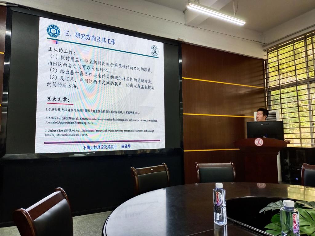 9月16日上午,陈锦坤副教授在砺志楼114会议室介绍了不确定性理论及其应用团队。他首先讲述了团队建设的基本情况,从2004年开始,公司以讨论班的形式展开学术讨论,已历经16年。接着他介绍了研究方向及其工作的主要领域涉及粗糙集基础理论工作(公理化)中的覆盖近似算子和公理化问题、覆盖粗糙集约简与概念格属性约简、多粒度信息融合以及与其它领域的交叉研究等。最后他向研究生们介绍了学习该方向的所需要的基础知识。