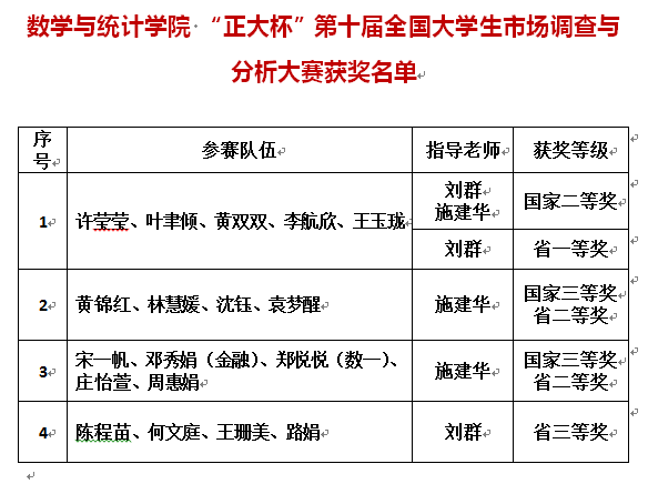公司施建华老师在讲授《抽样调查》课程的基础上,邀请刘群老师加盟联合带队指导、培训,组成四支队伍参加市场分析调查大赛,经过个人知识赛网考、校赛选拔到实践赛、省赛、国赛的五次角逐,参赛的同学克服突发疫情带来的种种困难,团结协作,荣获国家二等奖1项、国家三等奖2项、省三等奖1项。同时,公司在获奖数量和等级上取得该赛事的新突破。