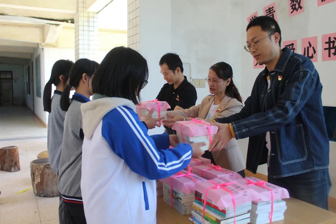 在到达云霄二中后,公司领导老师与云霄二中领导一同前往“常青数,快乐学”党员爱心书吧图书角举行捐书仪式,将公司旧书回收活动中回收的课外书和变卖书本折现所购买的书籍一同捐赠给留守儿童。在丰富留守儿童阅读书目的同时,拓宽他们的阅读视野,慰藉心灵上的空缺。