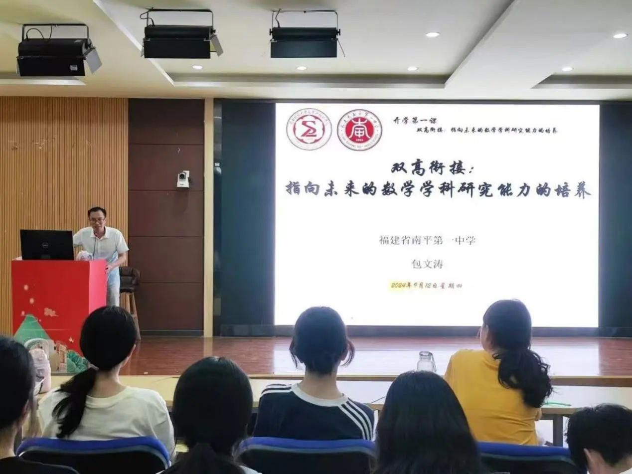 9月12日下午,公司邀请优秀员工、南平一中数学教师包文涛老师为2024级全体新生带来了《双高衔接:指向未来的数学学科研究能力的培养》的专题讲座。包文涛老师分享了从“高中”到“高校”的数学创新思维能力的培养的双高衔接,助力新生拓展数学思维能力。