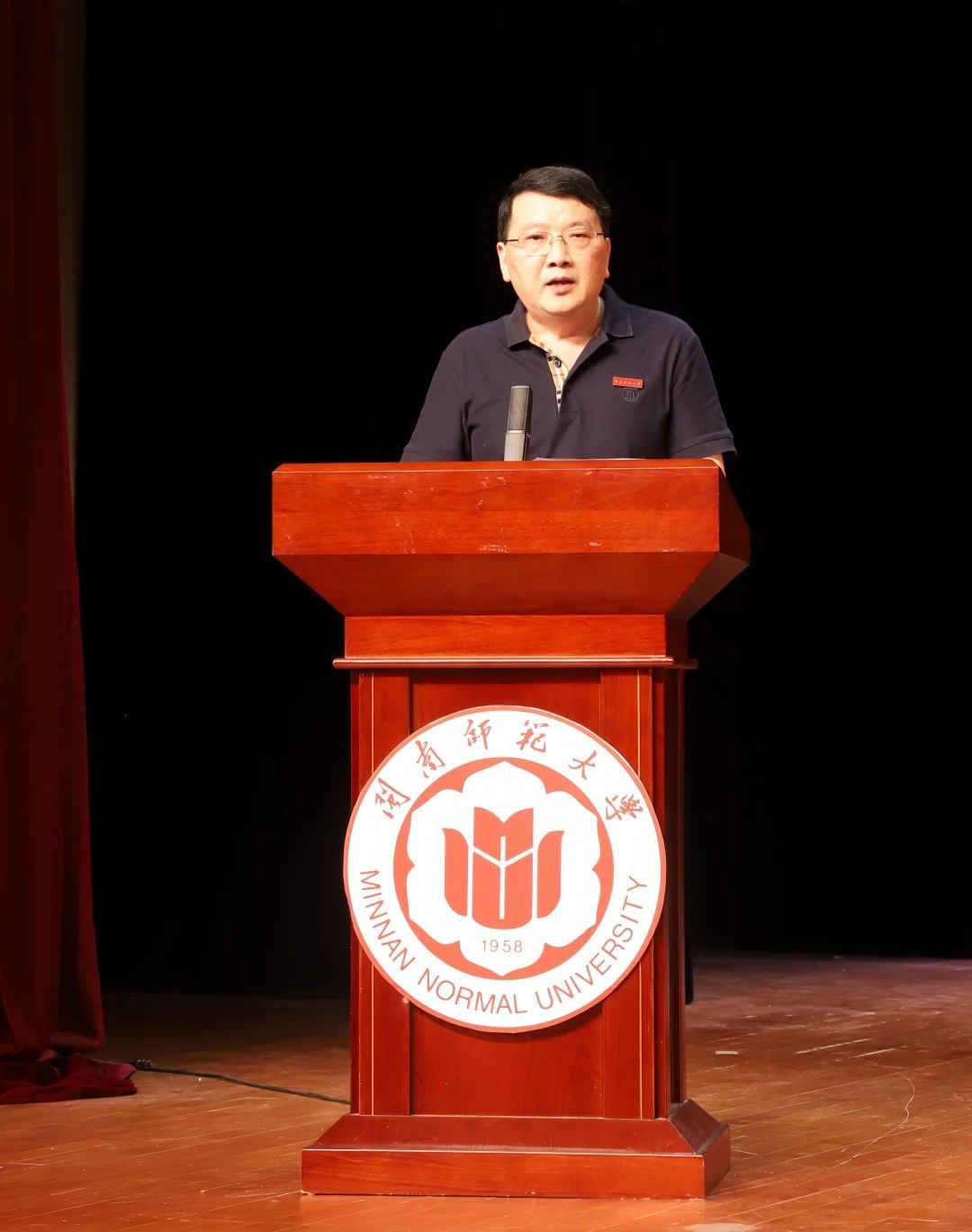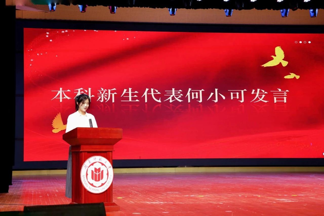 2024级本科生何小可作为新生代表发言。首先,她为公司提供这个舞台表示衷心感谢。同时祝贺各位新生,能在闽师相遇,带着沉淀,怀揣希望,踏入新的学府。她表示对校园充满好奇,期待校园生活,并会在接下来的学习生活中践行梦想。她祝愿24级新生能够勇敢面对挑战,相信大家在未来的老员工活能够创造属于自己的一番天地。