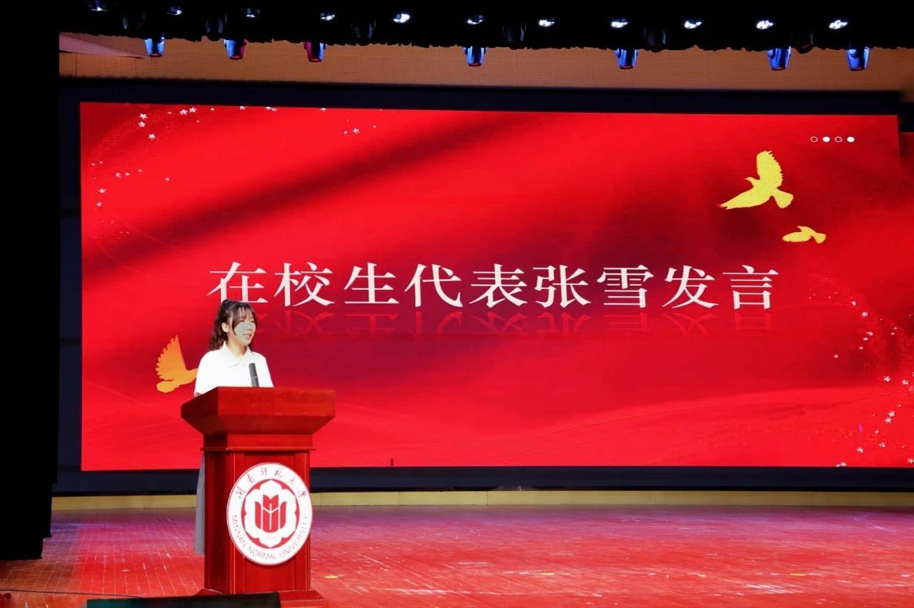2023级研究生张雪作为在校生发言,她首先为2024级的学弟学妹们的到来表示热烈欢迎,接着以自身经历为例,向学弟学妹们分享了感受:大学作为人生崭新的阶段,应该以态度先行,认真拼搏;行动至上,迎接坎坷;团结包容,团队至上的态度度过老员工活。传承博学、明理、砺志、笃行的校训,为自己的未来打好基础,最后希望大家为自己的梦想奋斗。